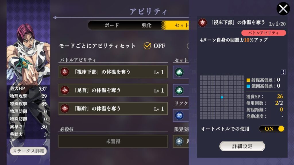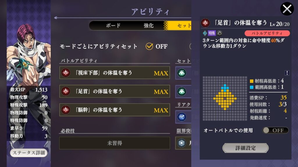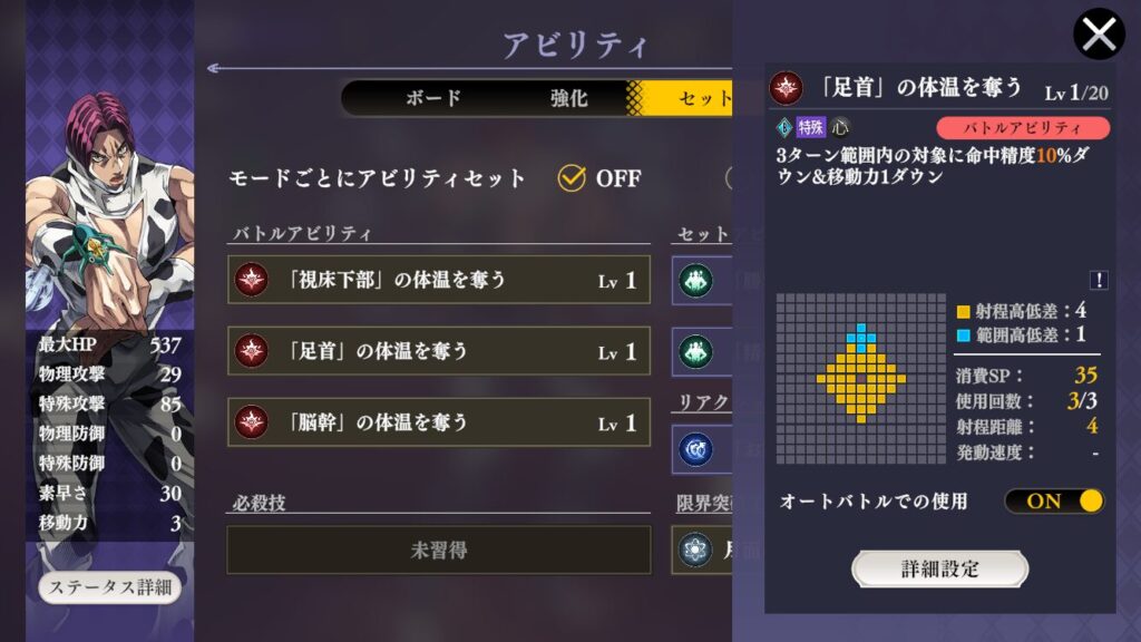 「足首」の体温を奪う:3ターン範囲内の対象に命中精度10%ダウン&移動力1ダウン
