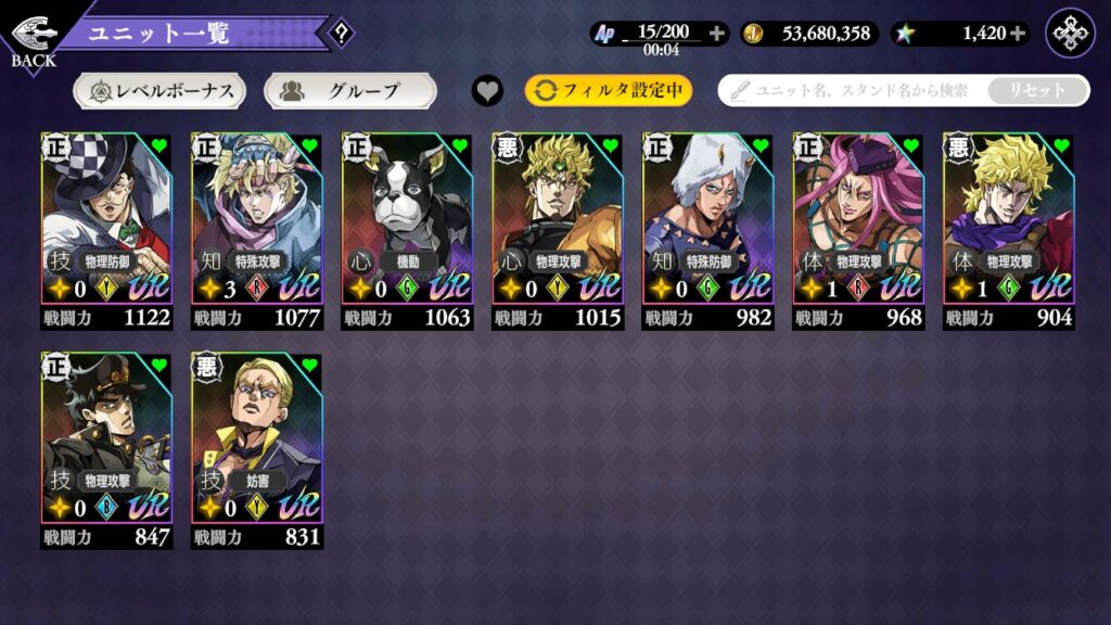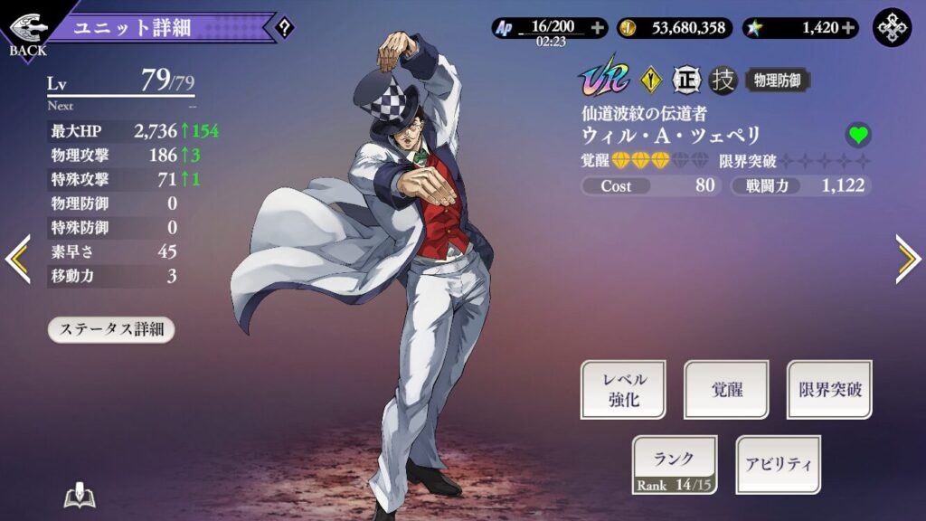 戦闘力はステータス合計値(HP重視)が主で、ツェペリさんのタンク設計が無凸から高く出る。